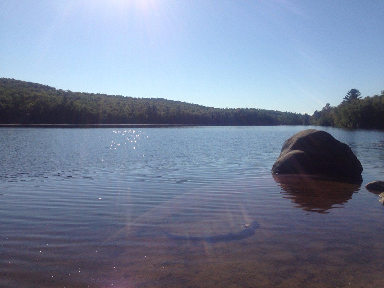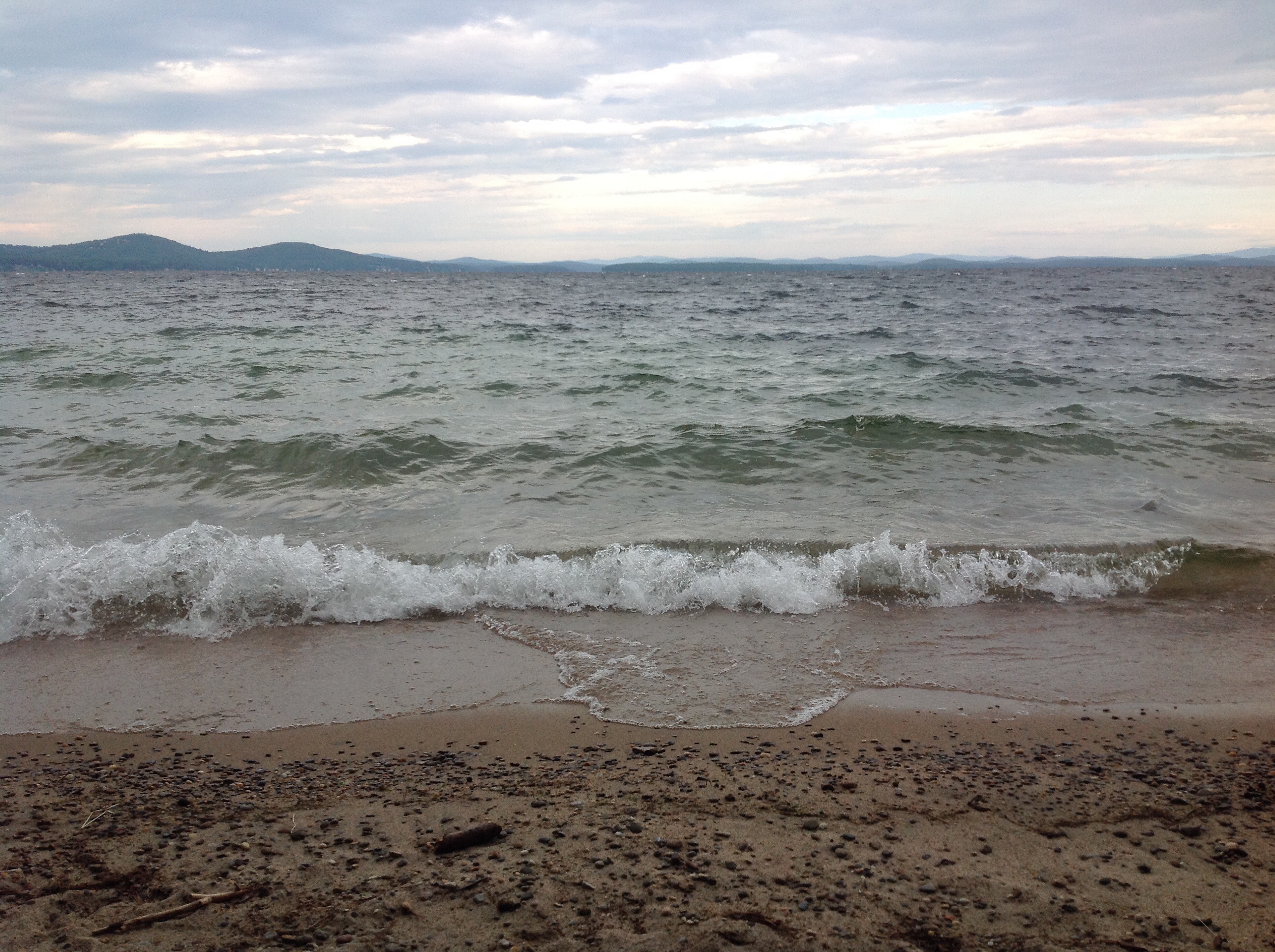 “Are you still asleep?” I asked my wife. Her eyes opened a crack, and I said, “It’s the eagle. I can hear it.” She lifted her head from the pillow to listen, and the eagle cried again. We both rolled out of bed and pulled on our swimsuits. It was 6:20. The wind was nearly still, and the lake was the quietest it had been this trip. The air was cool but weighted with a touch of humidity. I got to the beach first and high-stepped into the water until it was up to my waist, far enough out to see the eagle if it was perched in its usual tree, a towering hemlock just south of the camp property. The eagle wasn’t there, but a moment later, it glided overhead, wings held wide as it flew south and then banked eastward around the point. My wife arrived after it had gone, and when I told her where it was headed, she set out that way with a strong crawl stroke. She went perhaps a hundred yards and then switched to backstroke so she could look up at the trees as she swam. Soon, she rounded the point and went out of sight. I used to worry when she swam far away, alone in open water, but she’s a powerful, relaxed swimmer, and my anxiety has faded over the years. I swam up and down the length of the beach for a little while and then stood in the water, looking across the lake. A fog bank had settled over the low hills. Though it appeared static from where I was, I imagined being up close and watching it creep over the peaks and down their slopes, a slow, vaporous waterfall.